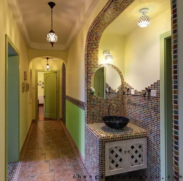 这是一个比较综合的过道设计,墙面、顶面和地面均融入了恰当的设计元素。风格气息浓郁,设计出彩。马赛克的大量使用告诉我们这家的装修费用不菲哦~~