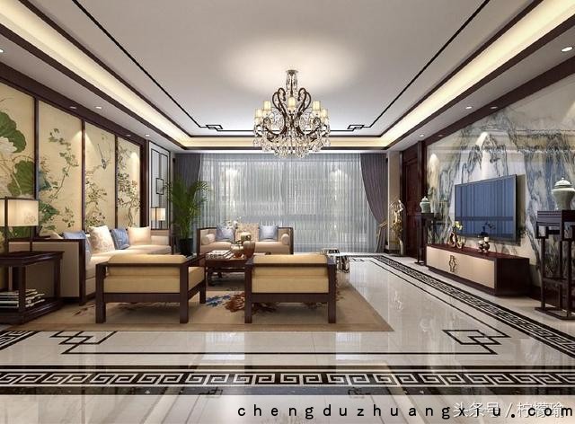 新中式风格 -- 客厅设计 客厅怎么装修一直是困扰无数准备装修客户的一大问题!客厅背景墙设计 沙发背景墙设计都可从此参考,整个空间设计显得尤为大气。线条设计同上介绍,地面回形纹选择经典经久。电视墙和沙发背景墙都采用了中国风画饰,沙发背景墙的分割使得具有屏风的风韵。客厅水晶灯的采用并没有对中式风格整体格调造成影响。可见设计师深厚的风格把控能力!