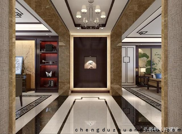 新中式风格 -- 门厅设计 所谓设计一步三景,入户无疑是一景,玄关的设计尤为重要,足以彰显品位。顶面和地面线条设计相互呼应,用材简洁并且恰到好处!线条设计不浮夸!给人清爽且不失厚重感。