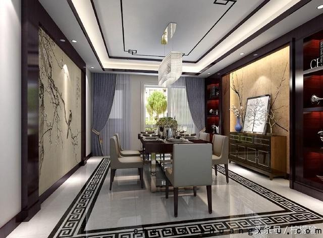 新中式风格 -- 餐厅设计 餐厅是用于吃饭会客交谈的一大区域,从功能考虑其交通流通性,可以就坐的人数都为基本问题;后期的餐厅背景墙,餐边柜设计都是很重要的装饰元素。国画,线条,不做赘述。