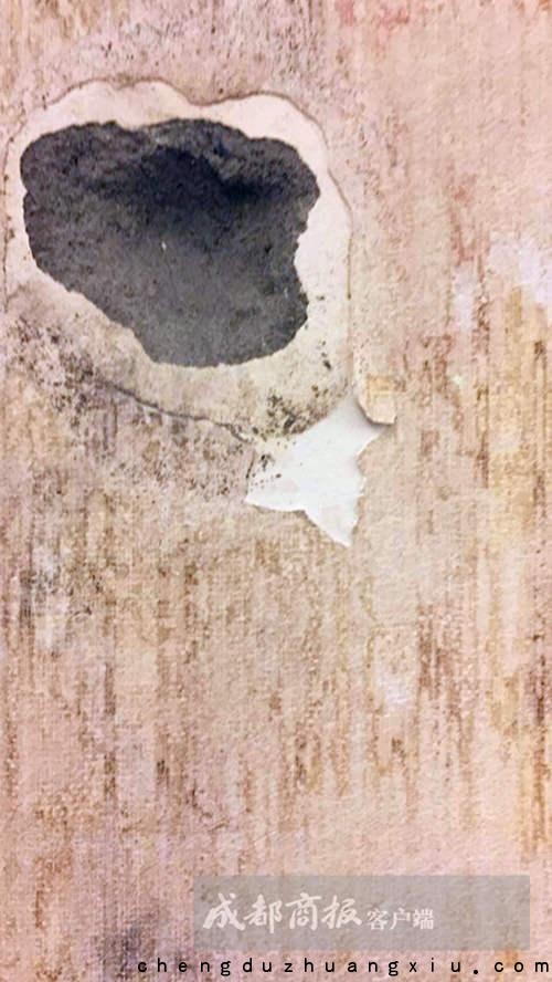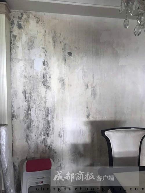 成都商报记者在采访中注意到,郭先生家原本是白色的墙纸略微发黄,部分区域呈现灰色。揭开墙纸的部分,一道道霉变的痕迹挂下来,摸上去有些潮湿。